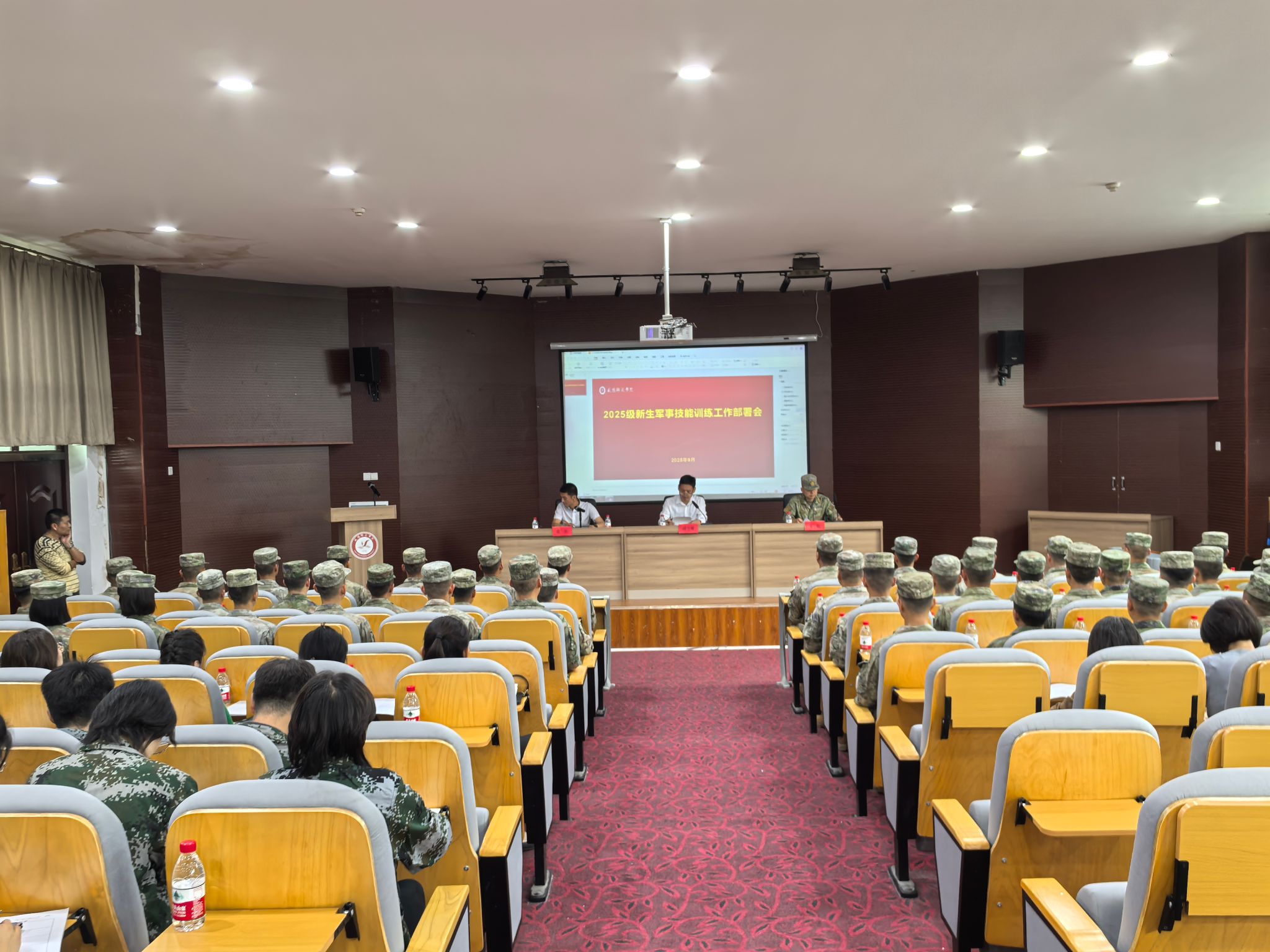 中国人民解放军71897部队全体承训教官、各二级学院主管学生工作领导、2025级新生辅导员、学生工作处相关科室负责人等共同参加会议。